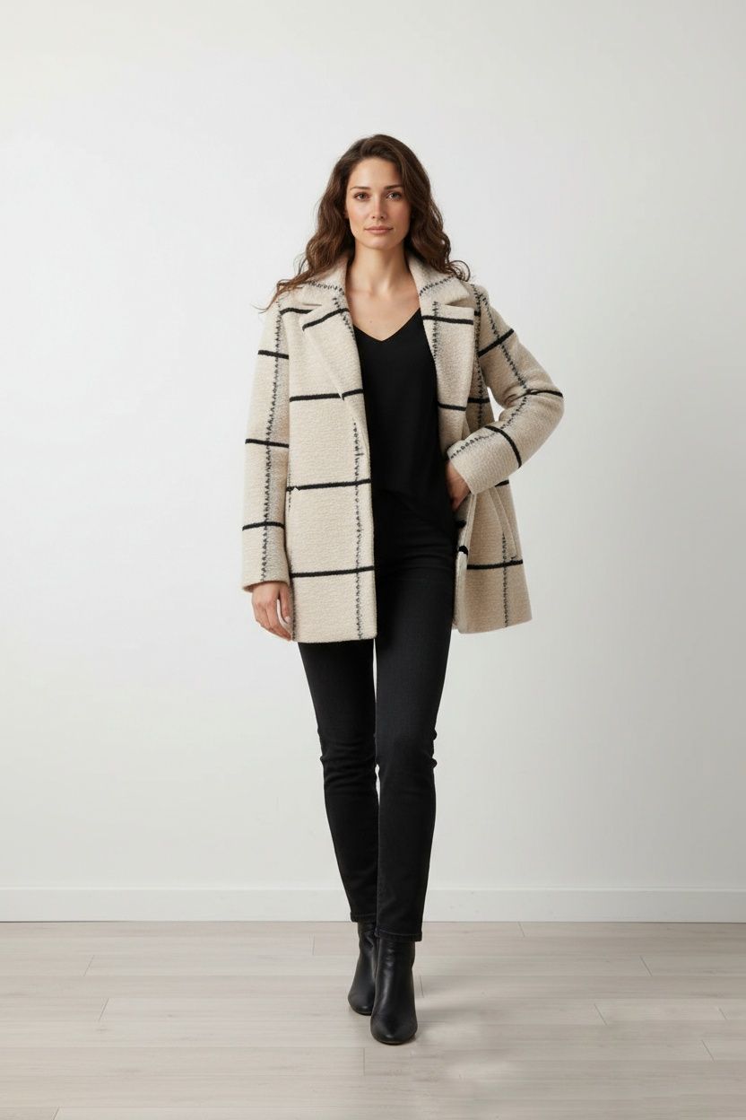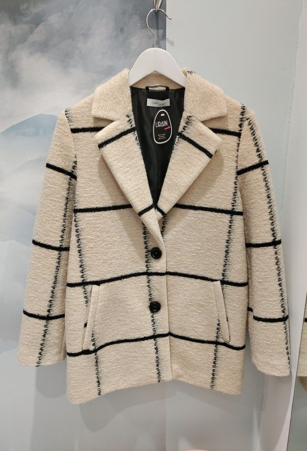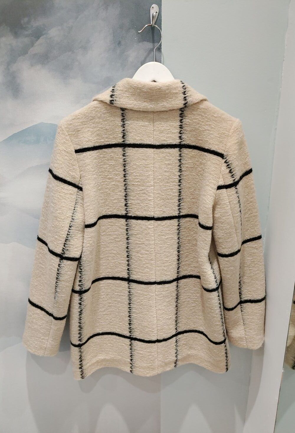 Abrigo recto de lana con cuello tipo americana. Es color beige con unas rayas negras que hacen cuadros. Muy versátil y abrigadito.