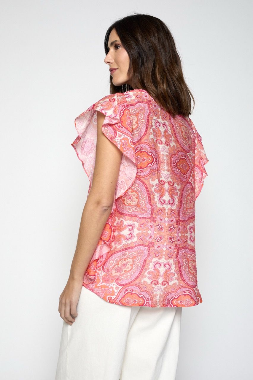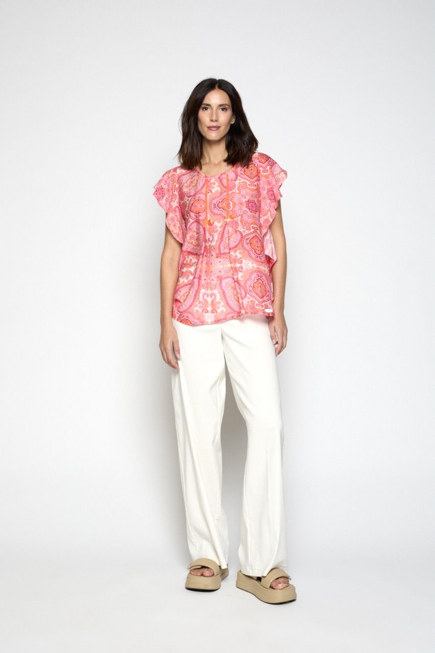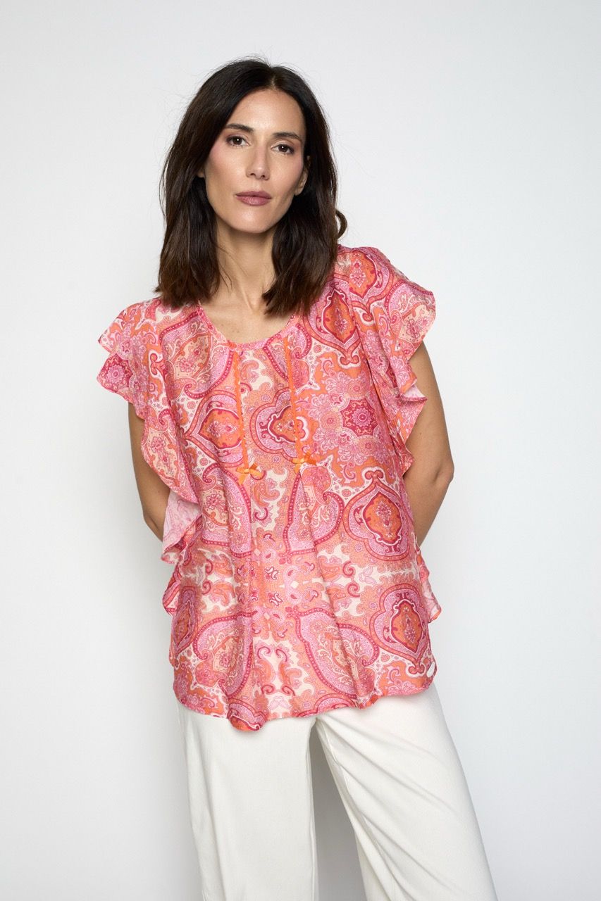 Blusón sin mangas confeccionado en viscosa de estampado orgánico. Lleva volante en las sisas a modo de manga y pliegues en la delantera.
