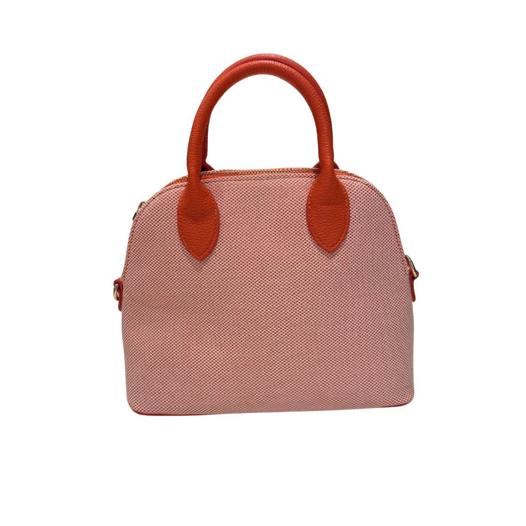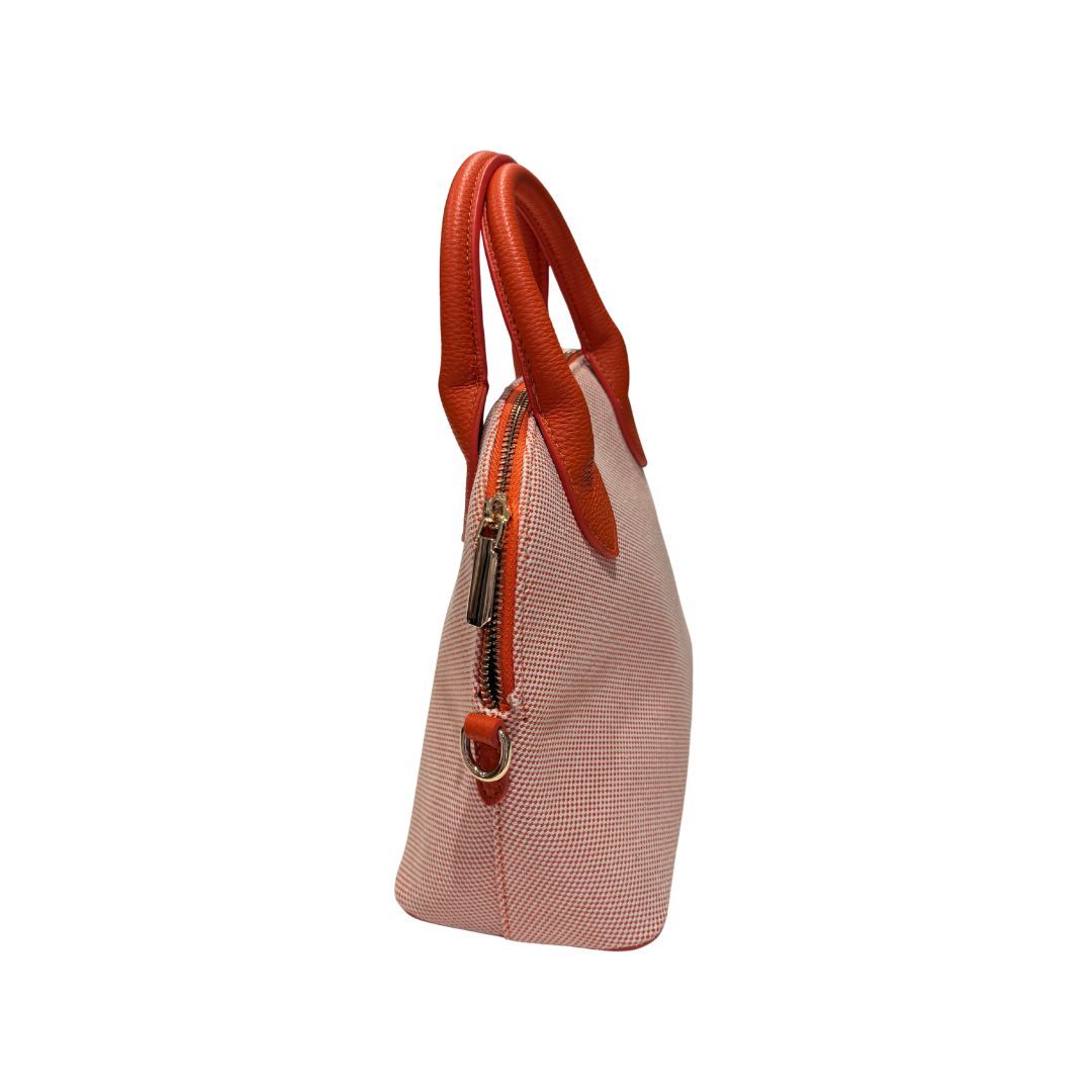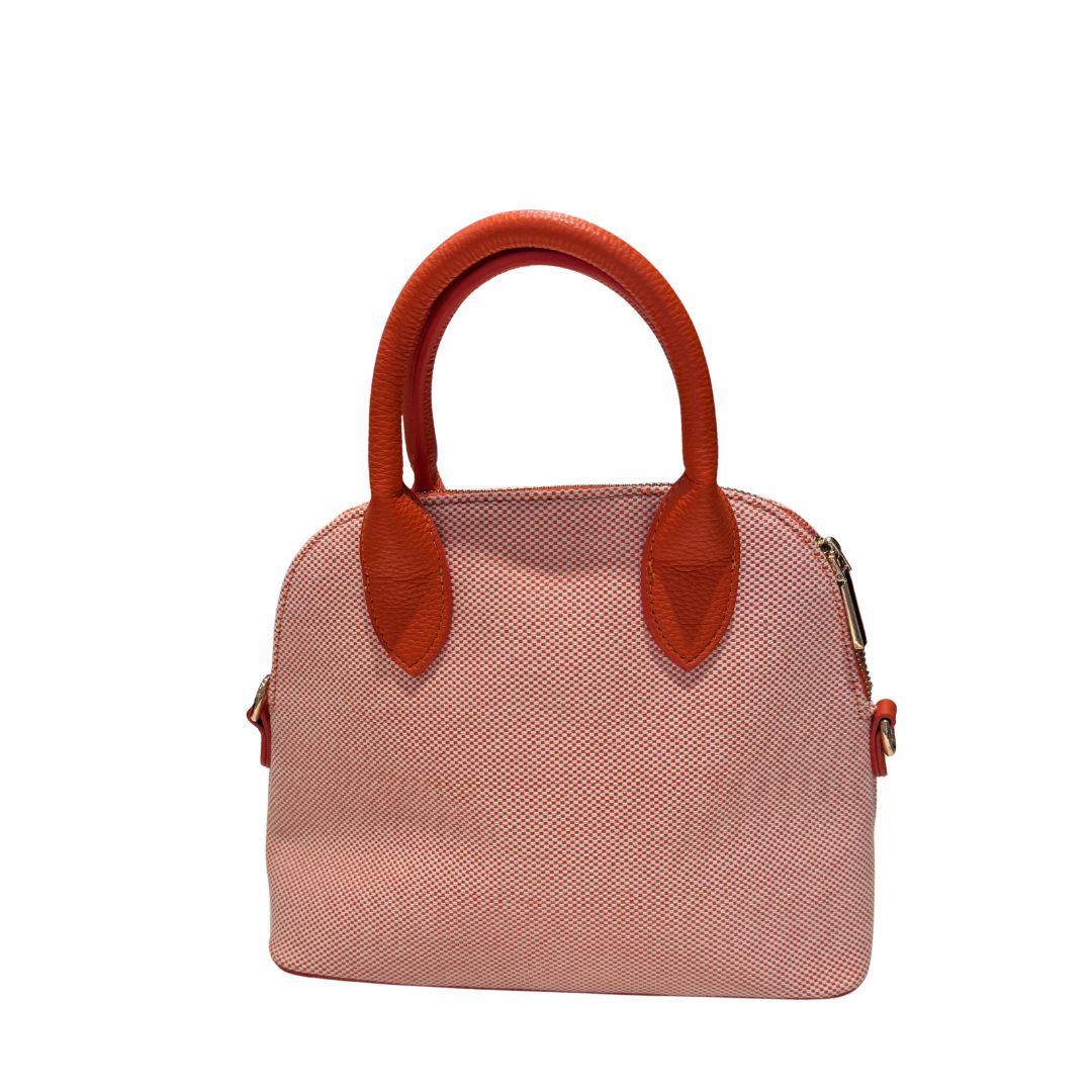 Bolso mediano con asa de mano en tono naranja. Está hecho con un tejido a cuadritos pequeños blancos y naranjas. Tiene correa para llevar cruzado.
