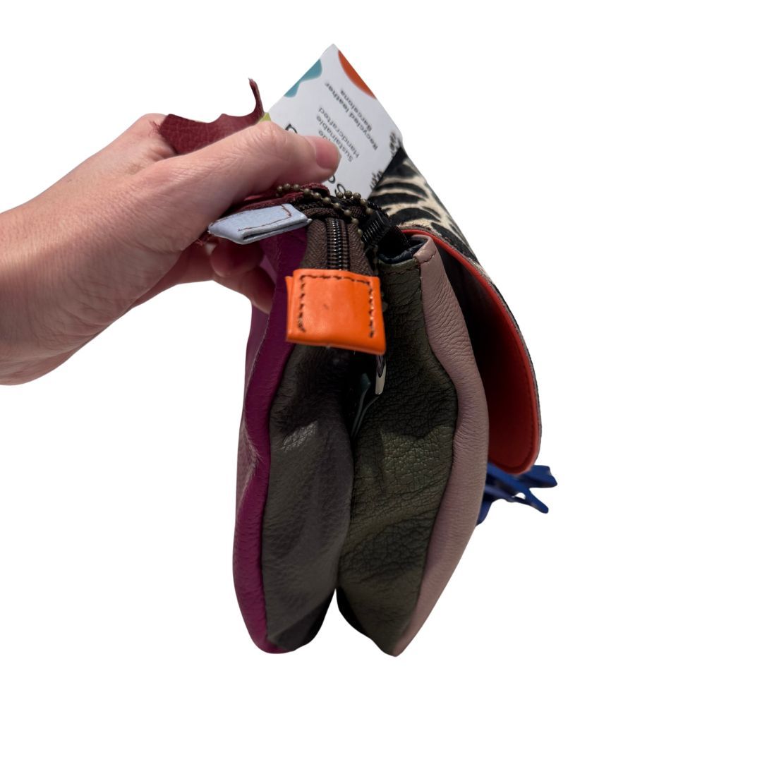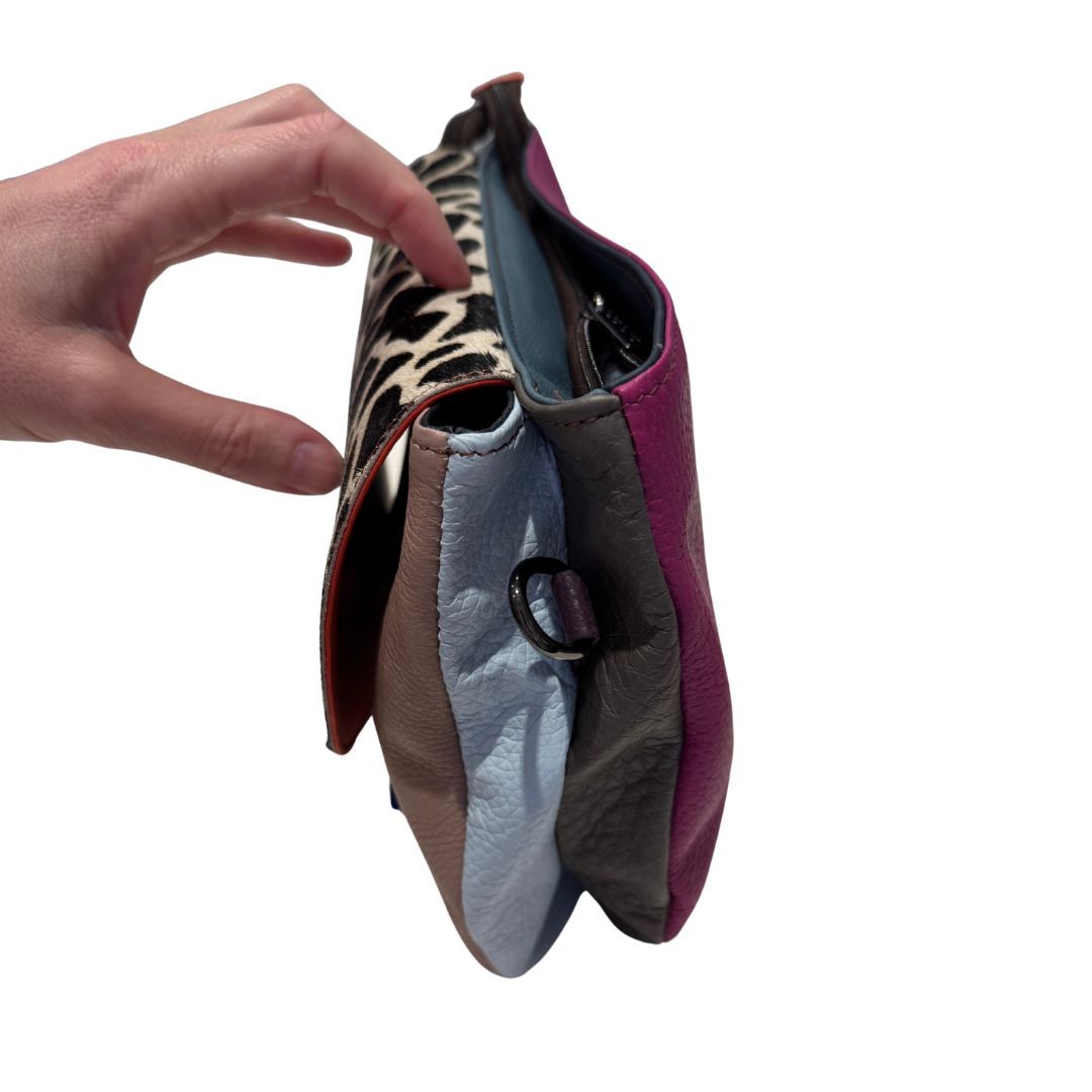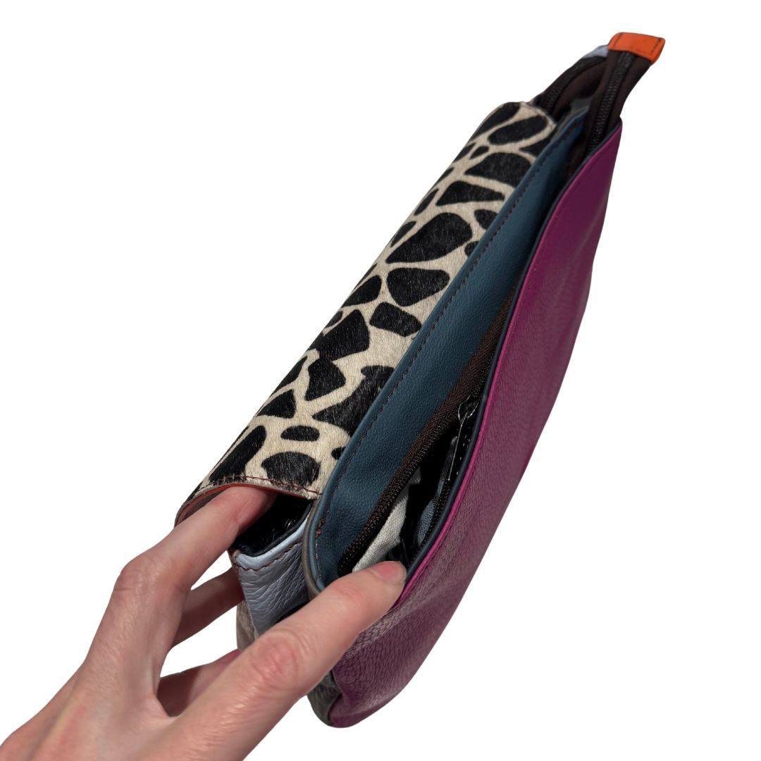 Bolso de piel mediano con 2 combinaciones de colores distintas en cada lado, según gires la tapa. Por un lado tiene la tapa con animal print, y por el otro lado la tapa naranja. Los laterales también son de colores distintos.