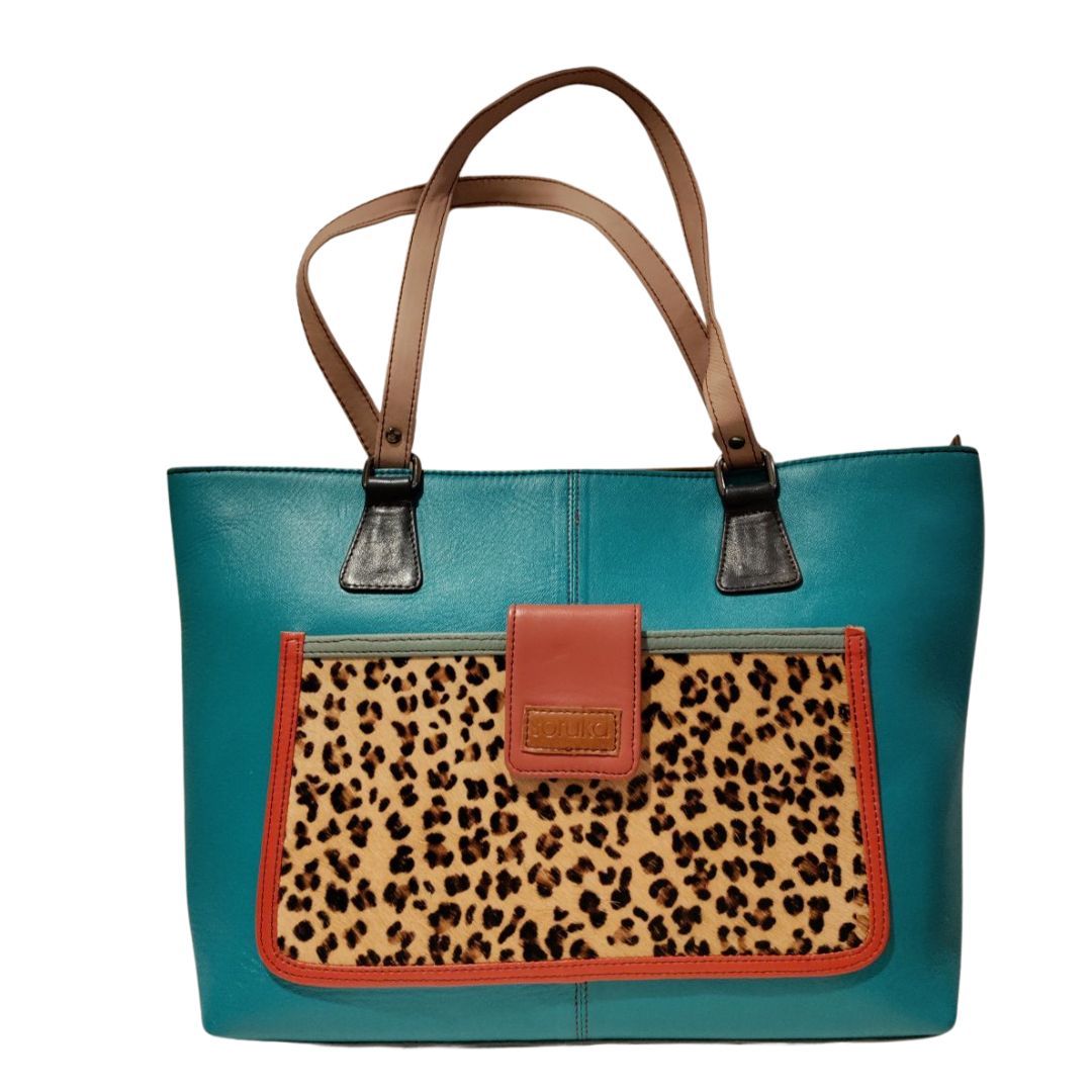 Bolso de piel en color azul turquesa con detalle animal print o leopardo por una cara y totalmente marrón por la otra. Tienes 2 en 1. Tiene un asa larga para llevar como bandolera.