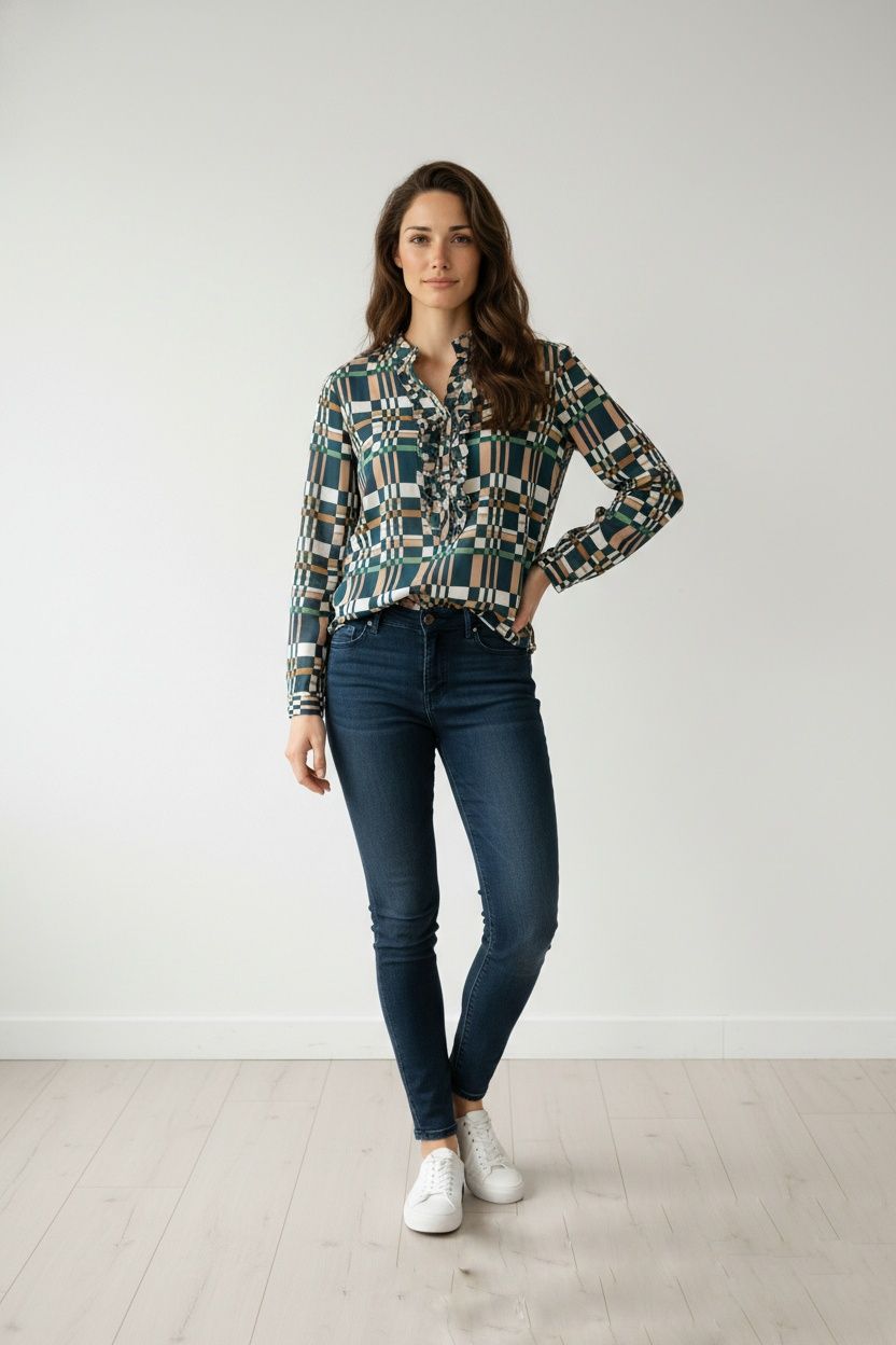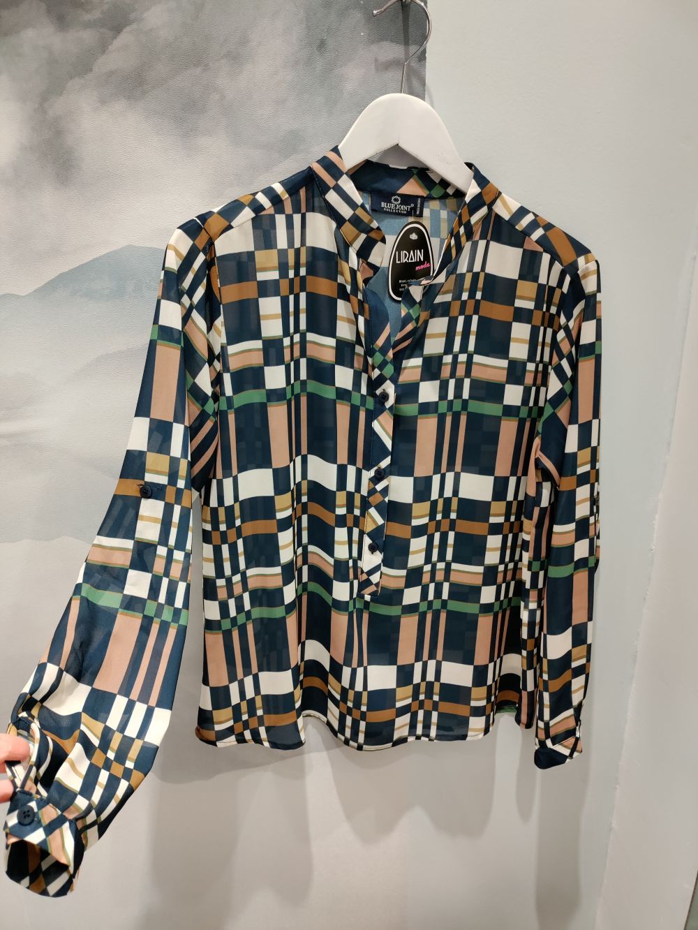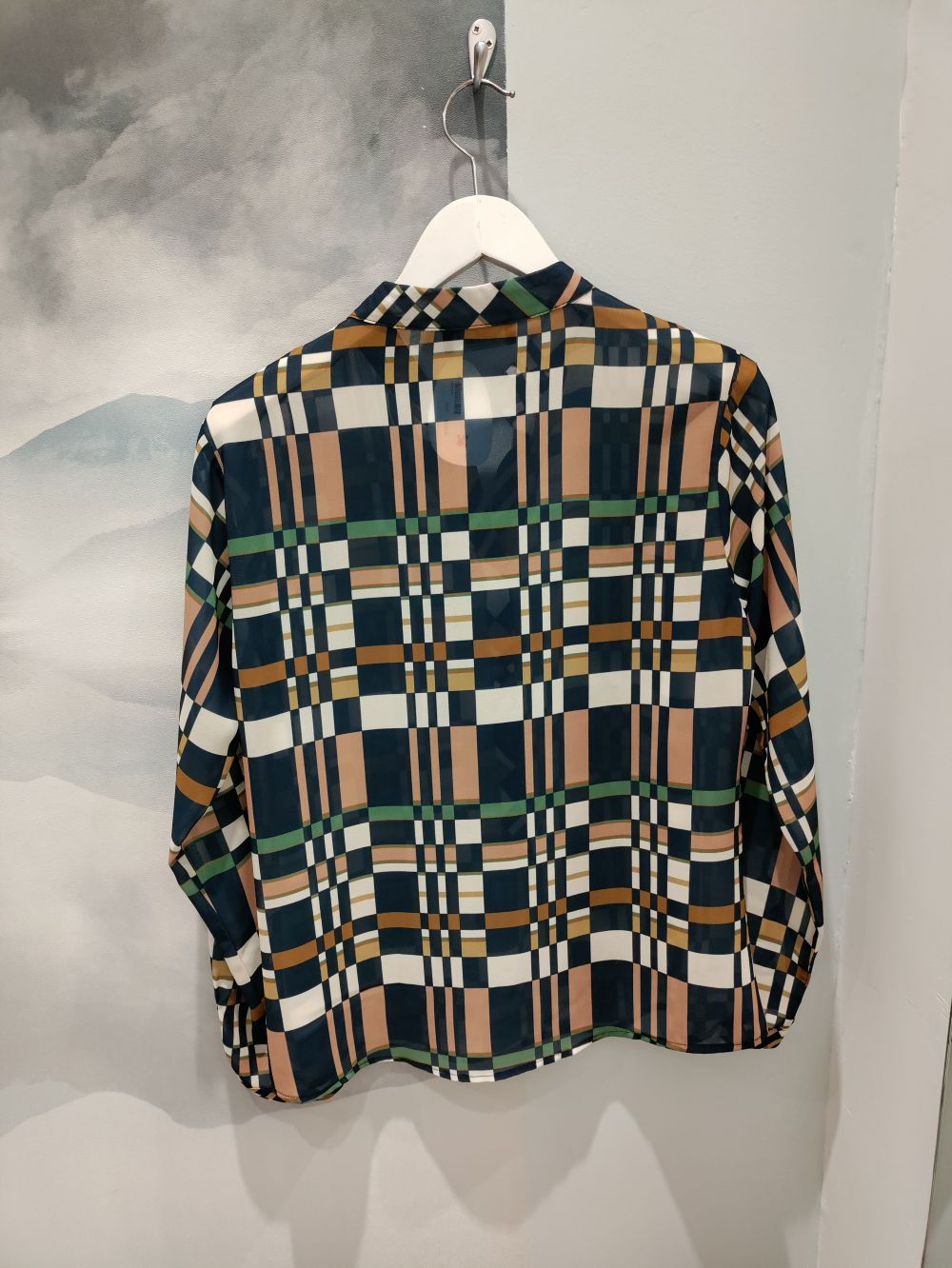 Camisa azul de cuadros marrones, verdes y blancos. Tiene mucha caída, tipo crepe.