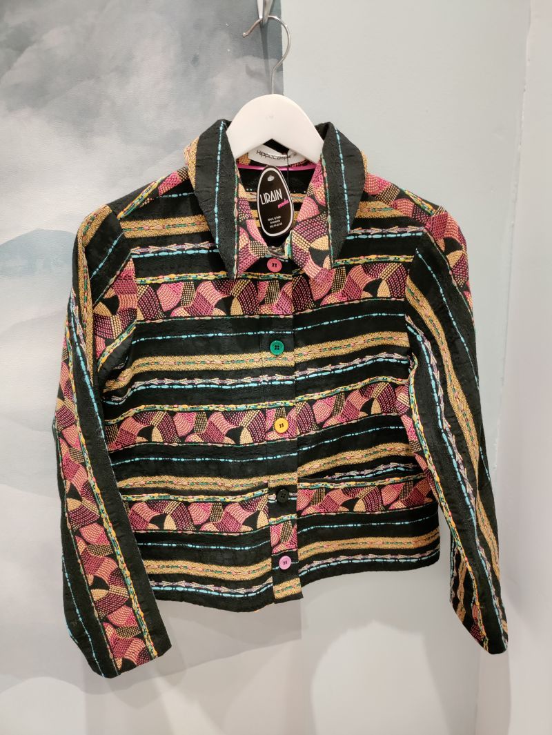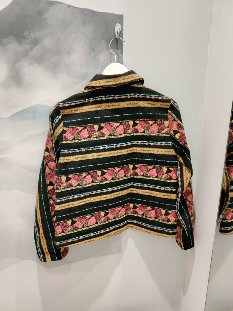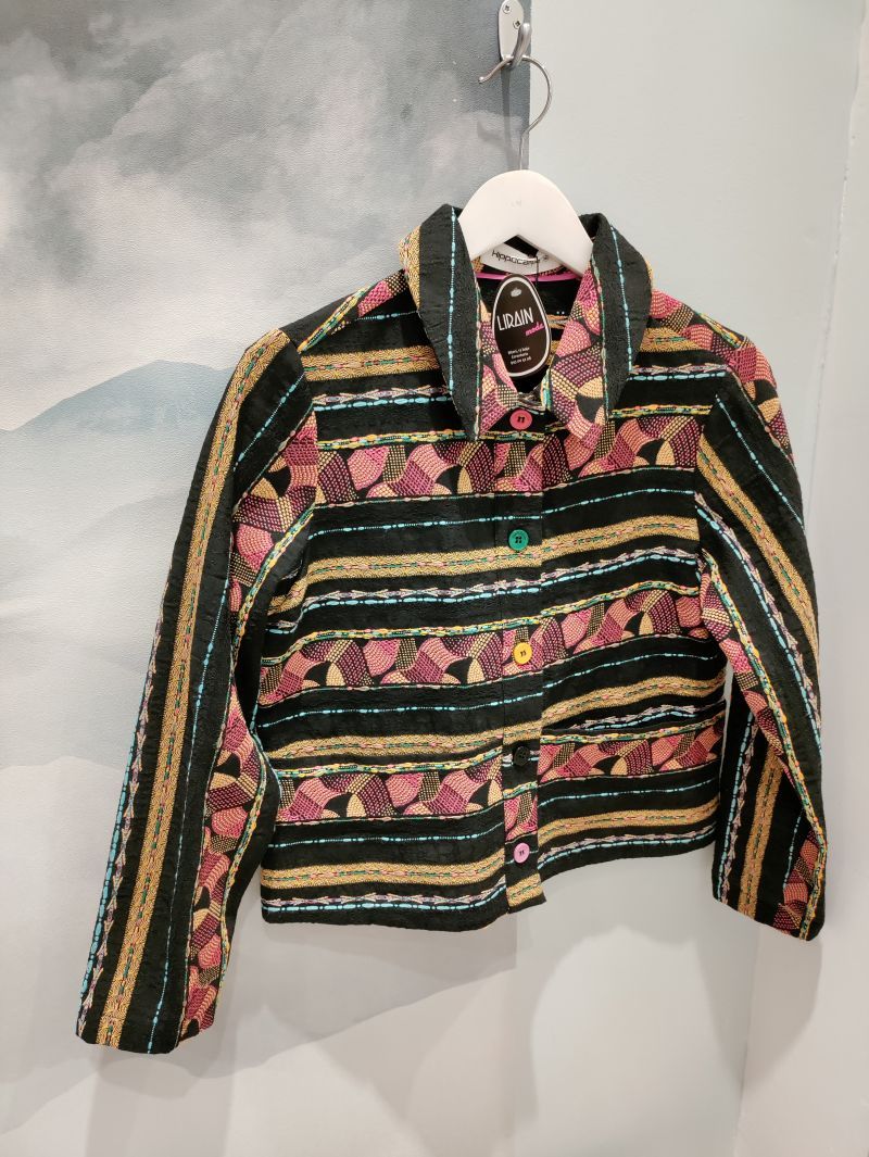 Cazadora en tela negra con rayas de colores, un poco estilo etnica.