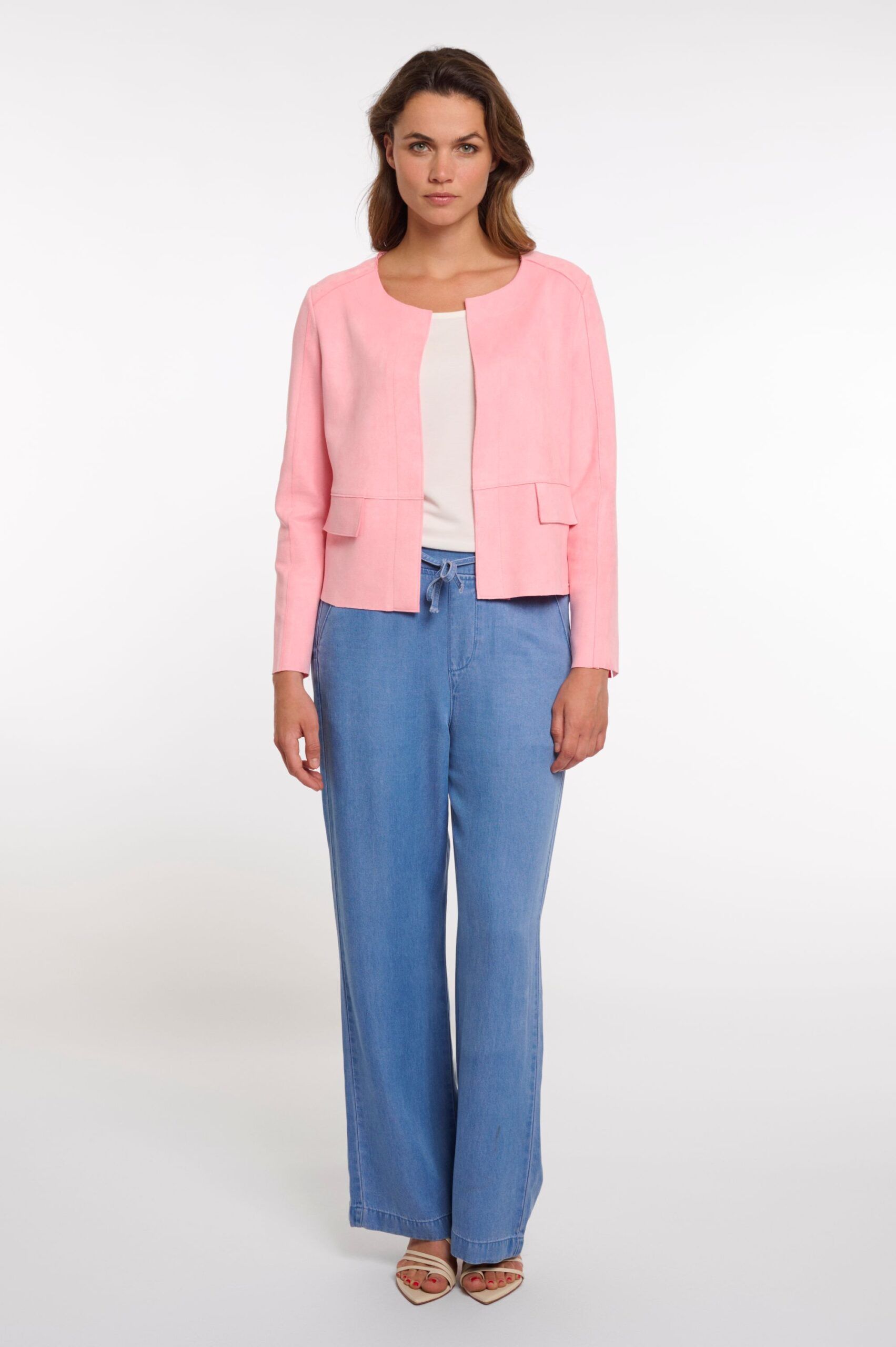 Chaqueta tipo antelina en color rosa clarito. No lleva botones para atar, queda suelta.