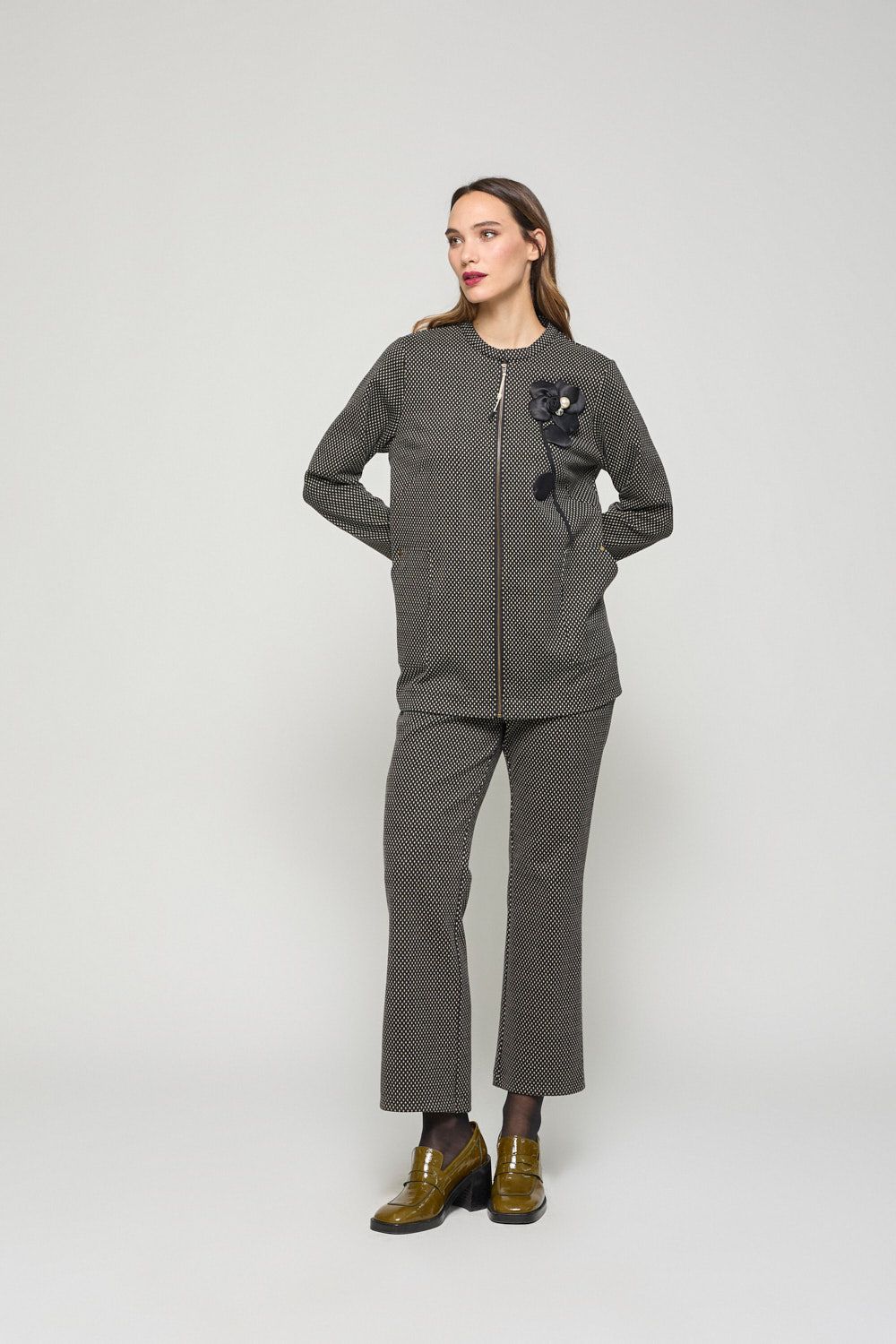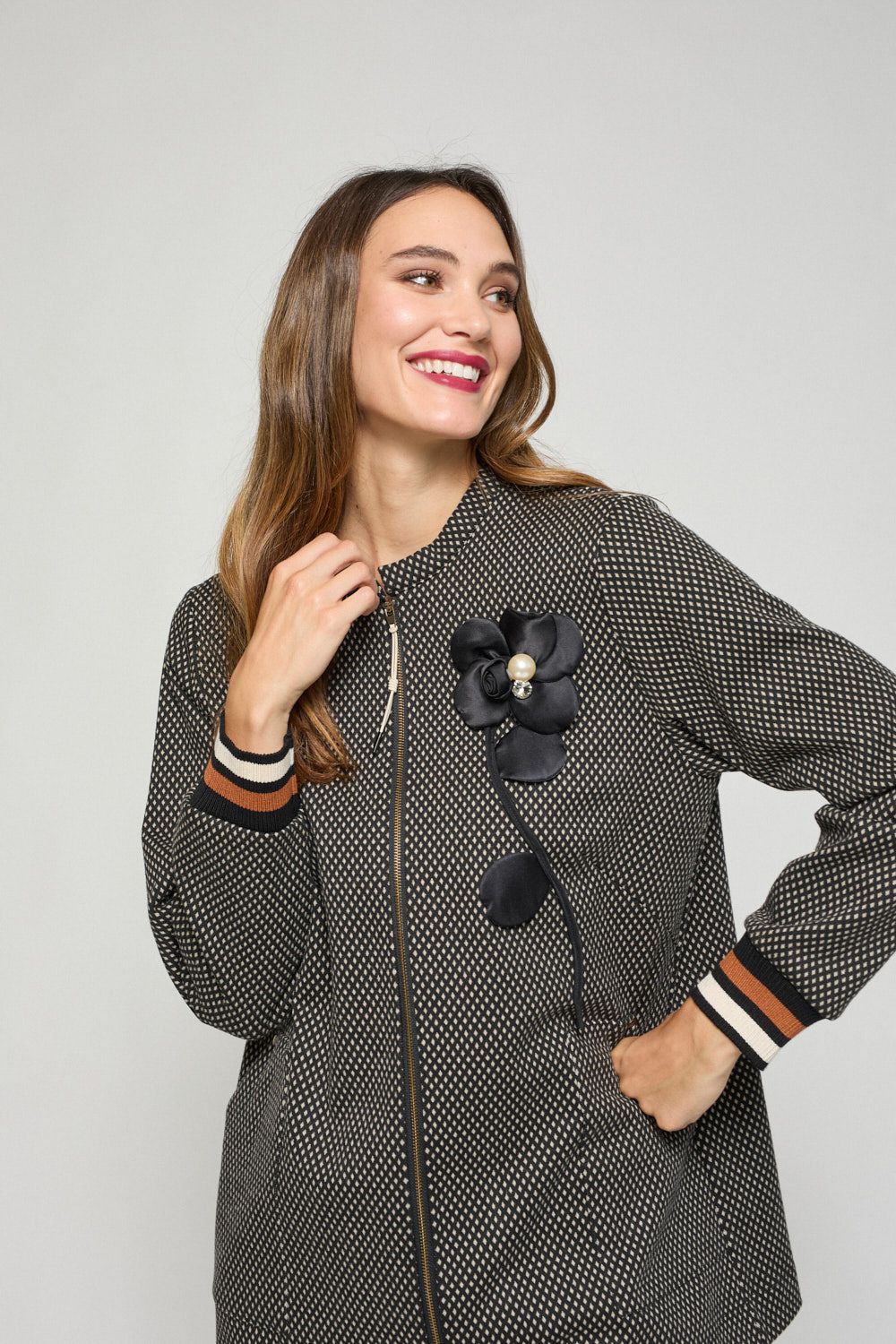 Chaqueta de punto estampado con dibujo de rombo pequeño. Cierre delantero mediante cremallera metálica. Detalle de flor en relieve en la delantera. Bolsillos plastrones. Largura a la cadera.