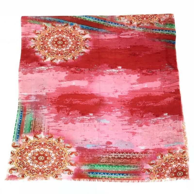 Precioso fular 100% lana fina en tonos rojizos y rosas, muy favorecedor.
