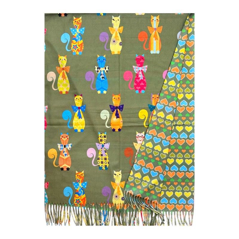 Fular en 30% lana 70% viscosa con estampado de unos gatos preciosos y divertidos por un lado y de corazones amorosos por el otro.