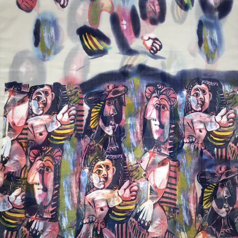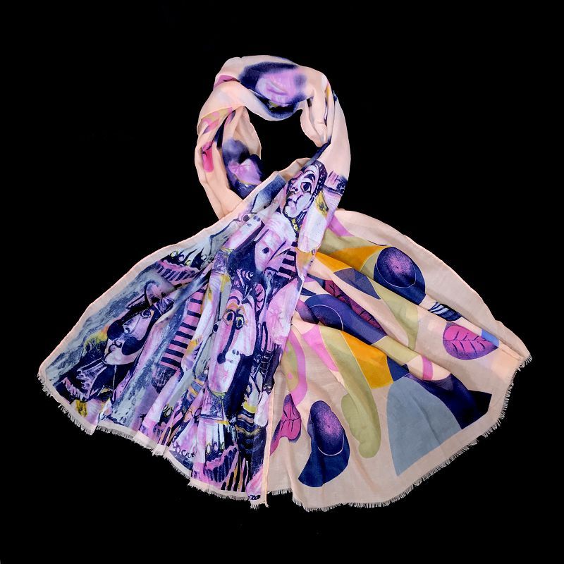 Fular en 50% Algodón 50% Viscosa con estampados del estilo de Picasso. Una punta tiene unos dibujos y la otra otros. Totalmente abstracto.