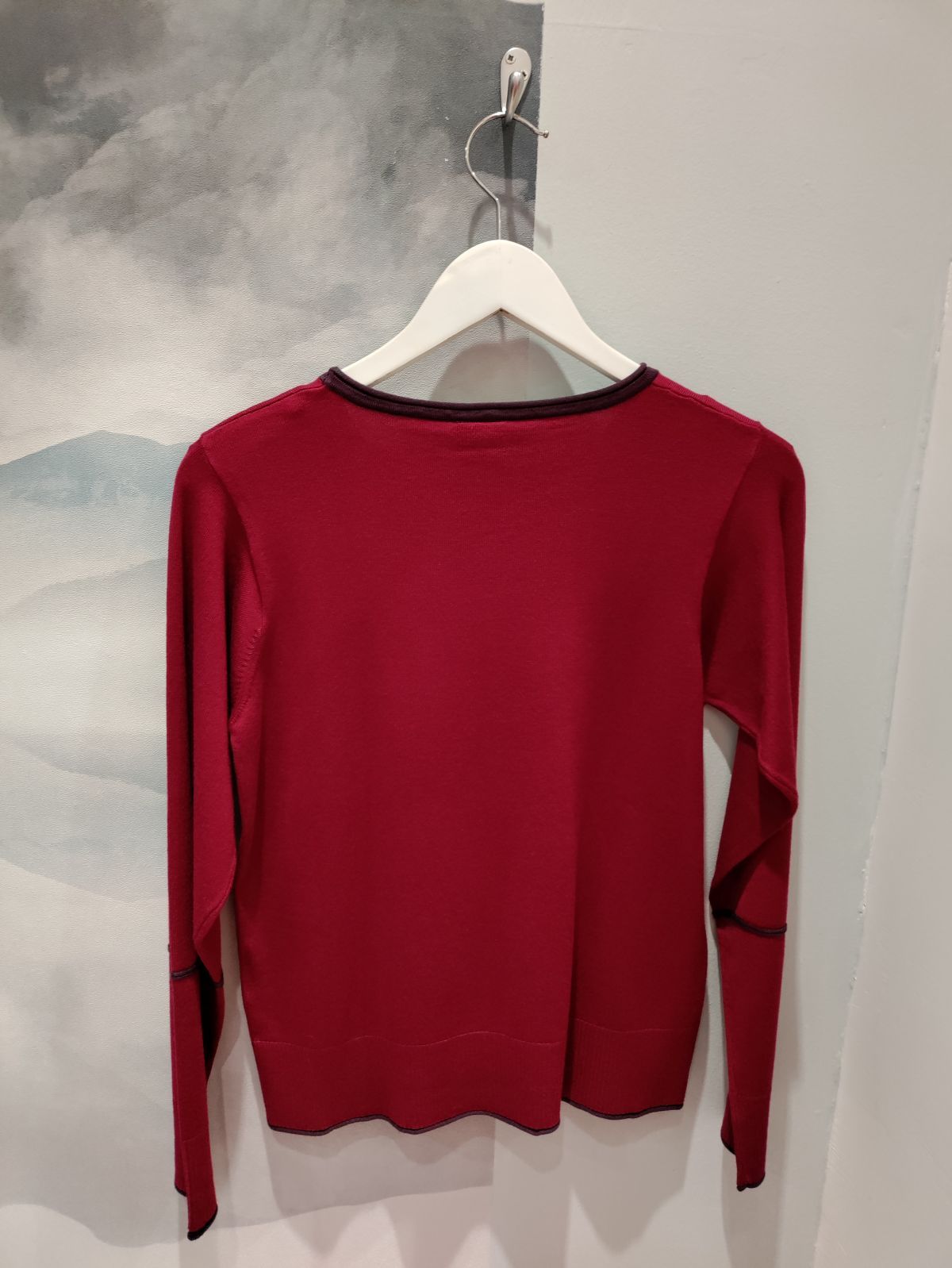 Jersey cuello caja en color cereza con ribetes en oscuro.