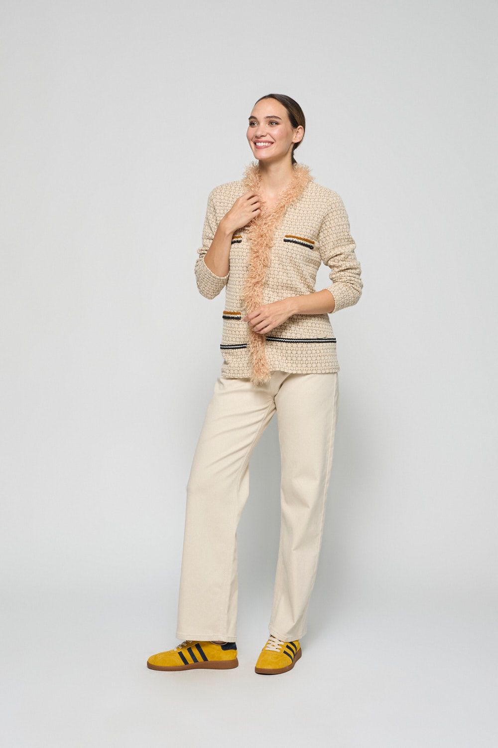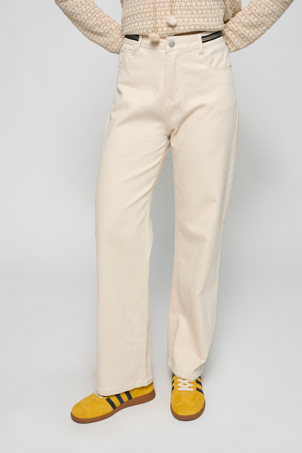 Jeans 5 bolsillos. Cierre en delantera con cremallera y botón. Detalle de pasamanería en cintura. Pata recta. Combinalo con el Jersey Nora para un look sport.