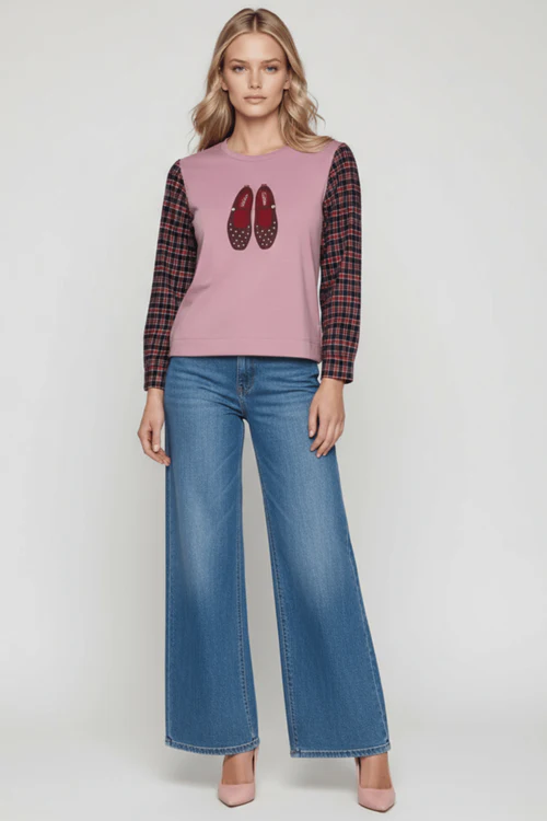 Esta sudadera rosa en tejido cardado de invierno desafía todos los estereotipos: unas bailarinas rojas con strass y logo bordadas te miran desde el delantero con actitud preppy-chic, mientras las mangas camiseras en cuadro escocés de tonos rojizos y negros añaden ese twist británico-rebelde con puño y botón funcional. El escote redondo mantiene la elegancia clásica mientras el conjunto grita personalidad. Es rosa con carácter. Es dulzura con estructura. Es la sudadera que redefine tu armario de invierno.
