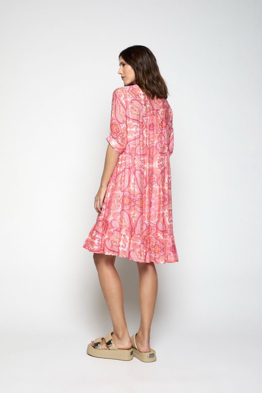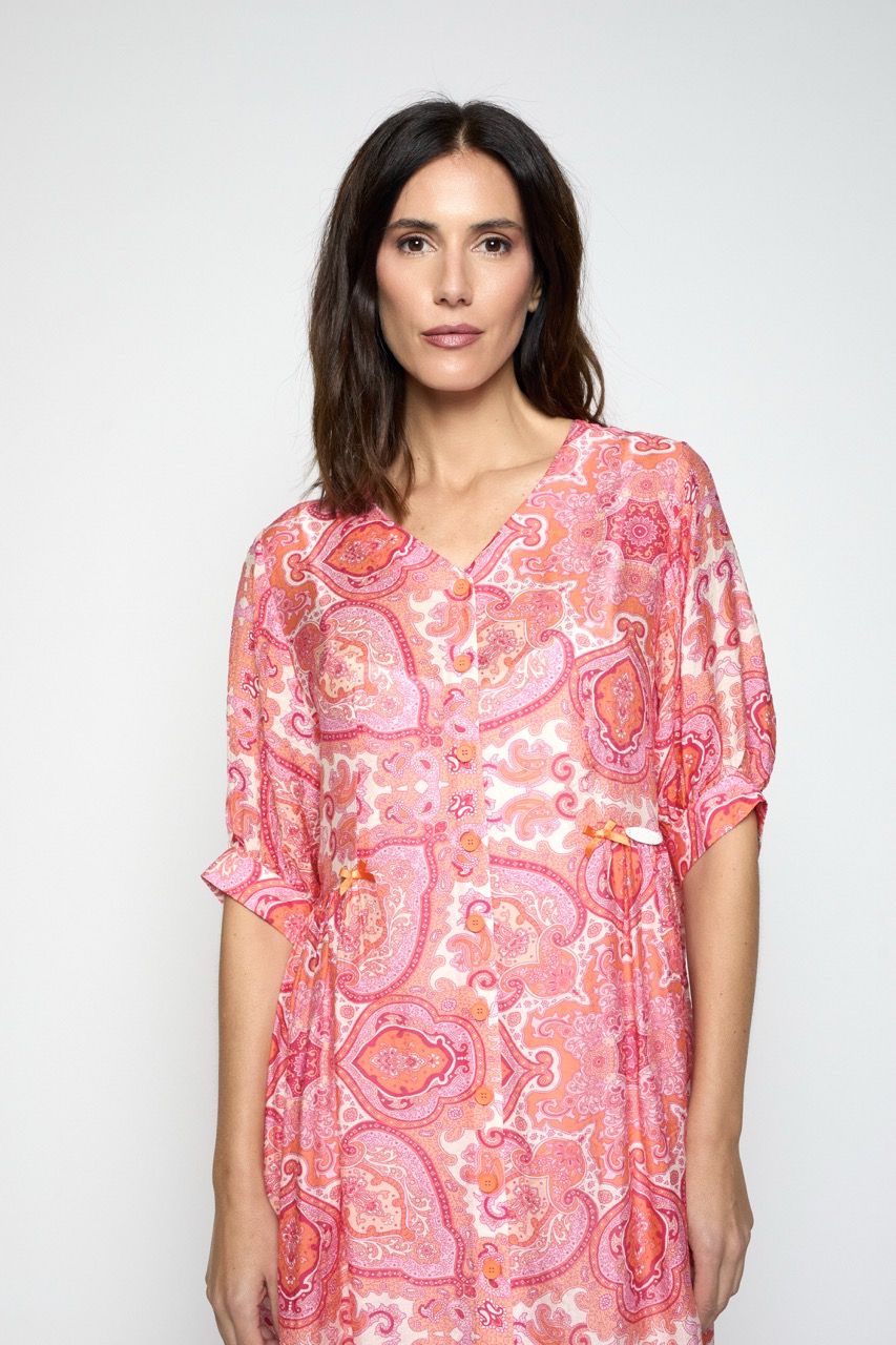 Vestido corto confeccionado en viscosa de estampado orgánico. Escote en pico. Cierre central mediante botones, bolsillos laterales, frunce en la cintura. Puedes llevarlo abierto a modo de abrigo sobre alguna pieza básica que tengas en tu armario para darle un toque diferente.