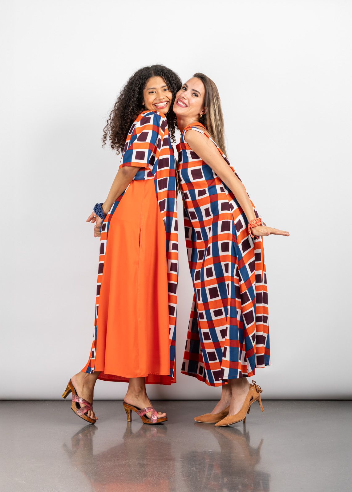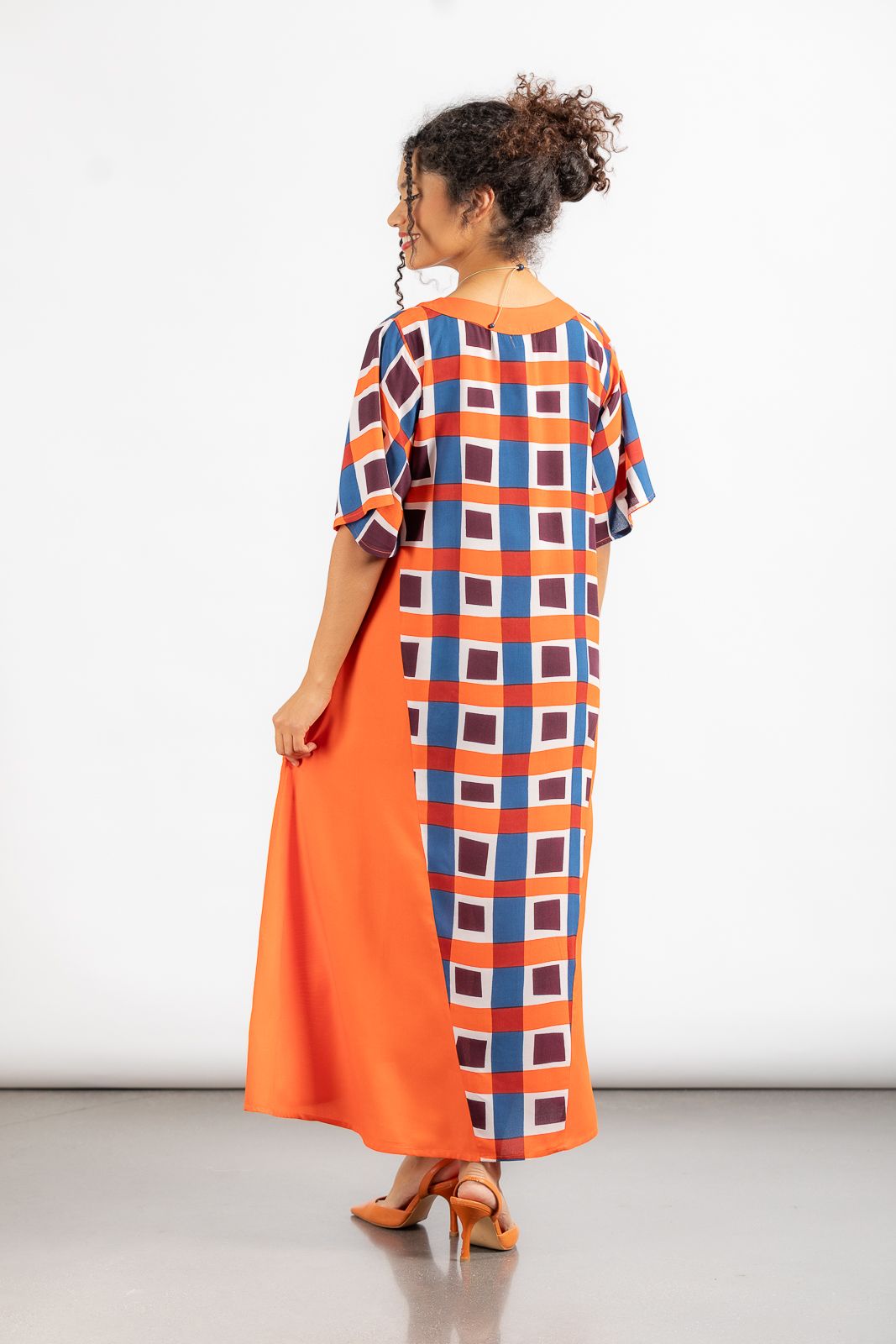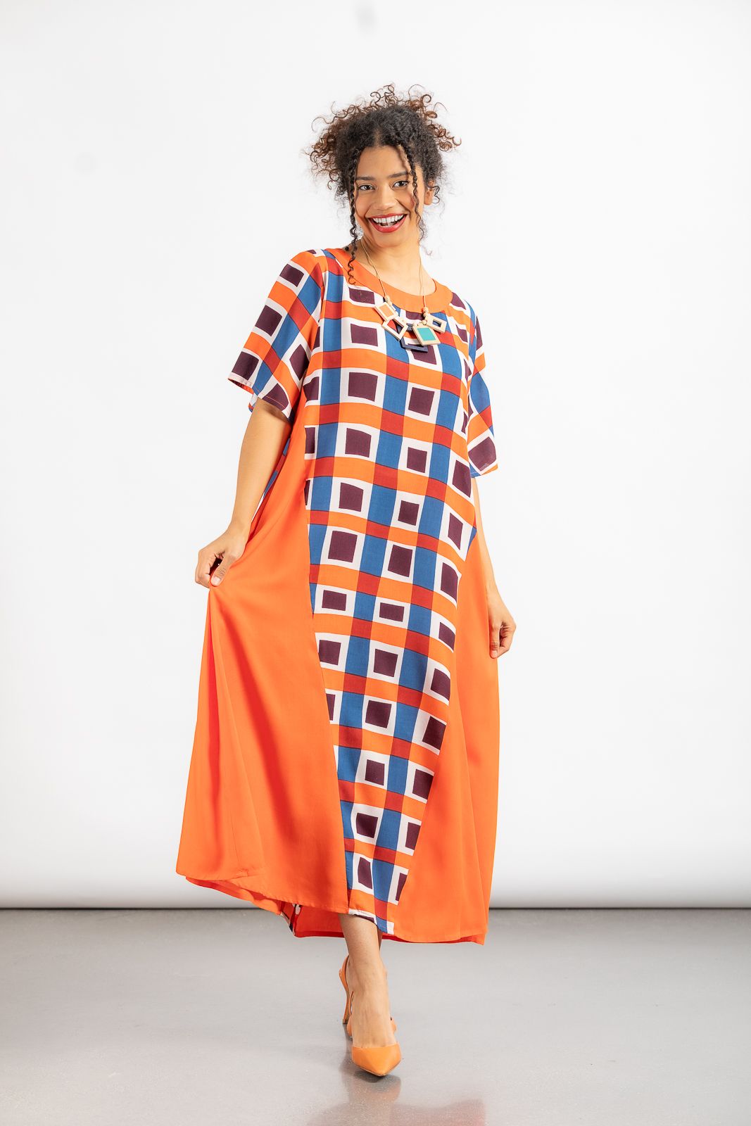 Vestido muy fluido con estampado de cuadros naranjas, azules y marrones y naranja liso a los lados. Es acampanado y con un cinturón puedes ajustarlo a tu gusto. Super original y fresco! Talla única.